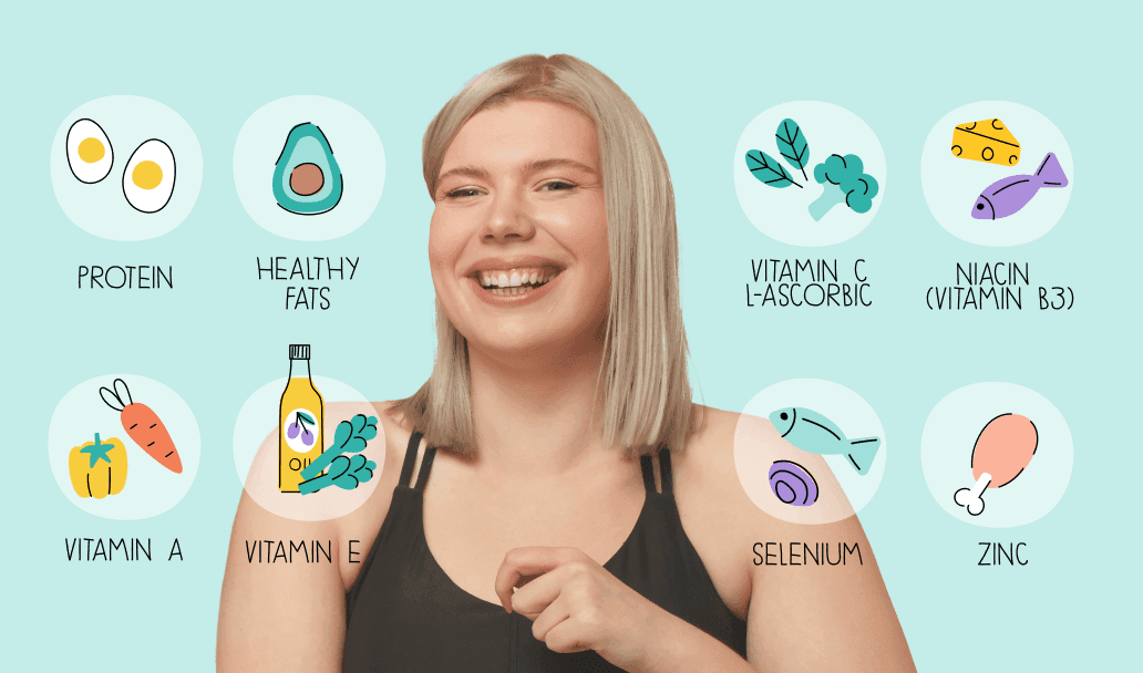 Foods with protein: eggs, almonds, chicken breast, dairy, lean beef, salmon, quinoa, peanuts, turkey breast; protein shakes that are good not only for skin but also for Gaining Weight And Building Muscles.